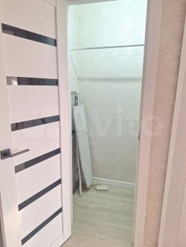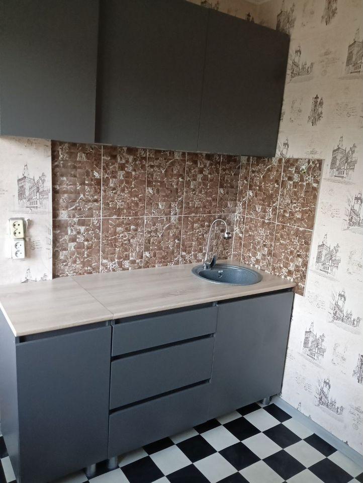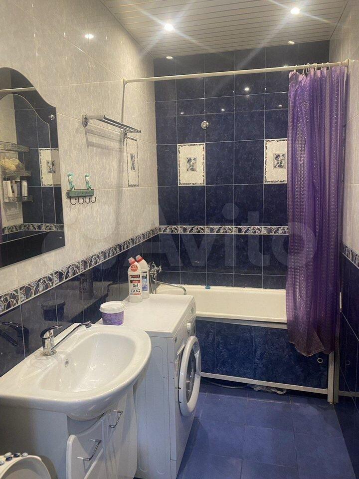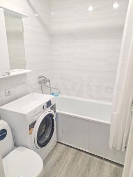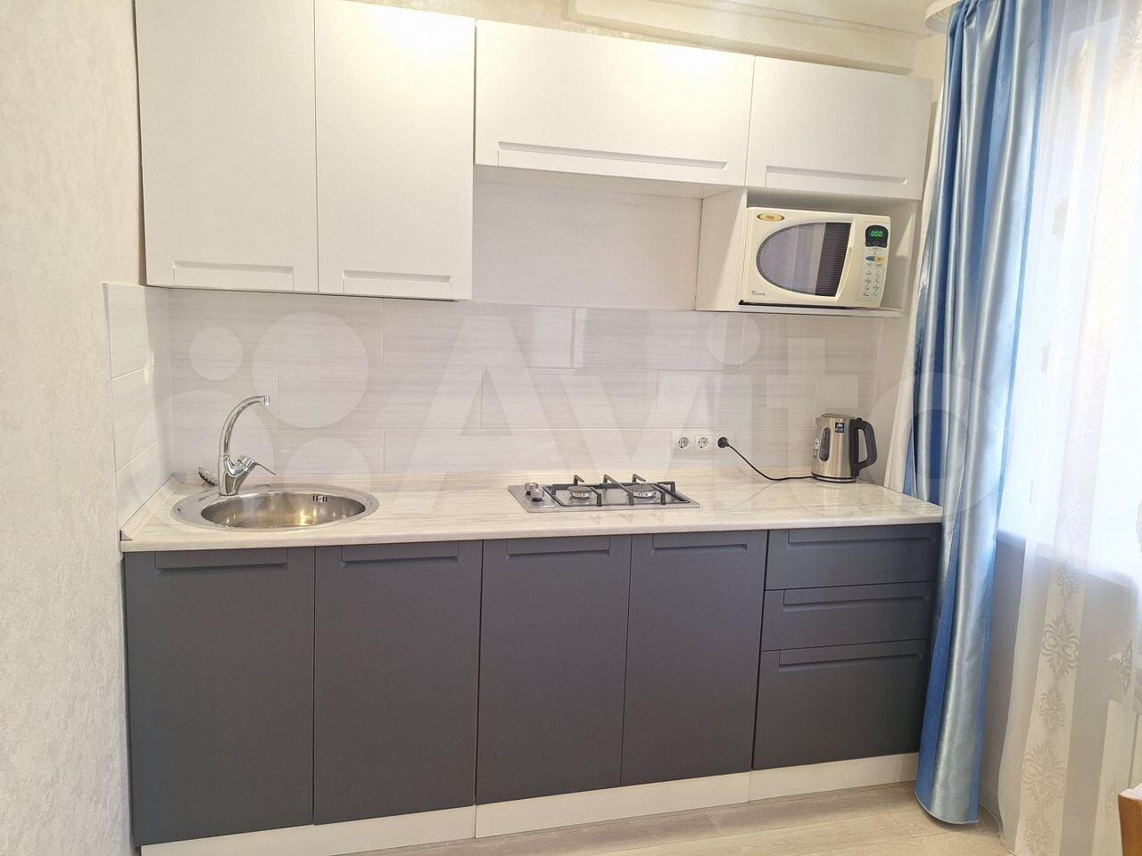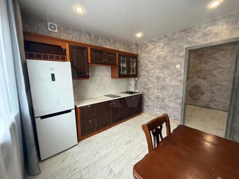 В квартире выполнен косметический ремонт. Просторная кухня оборудована необходимой бытовой техникой, включая холодильник и плиту. Из мебели имеются шкафы и письменный стол. Ванная комната совмещенная, оснащена ванной и стиральной машиной.