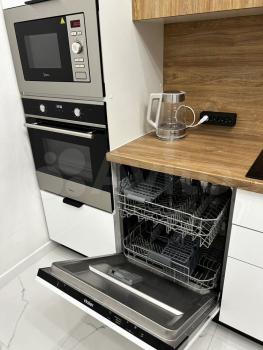 TEXHИKА: cтиральная машина, телевизор, кухонная плита, микроволновка, холодильник, чайник.