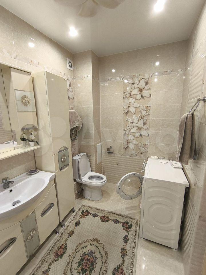 Санузел совмещённый, оформлен плиткой с узором. Стиральная машина автомат, есть биде.