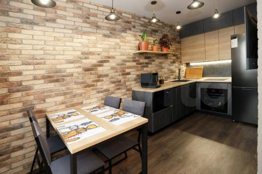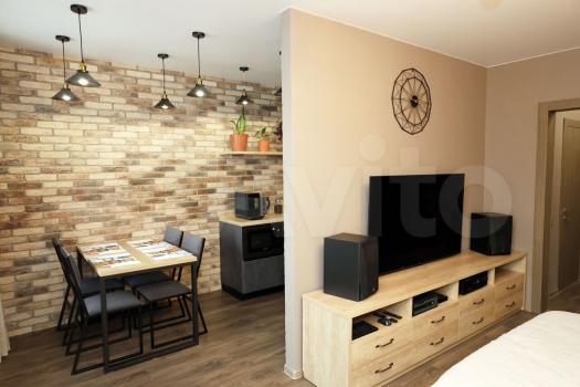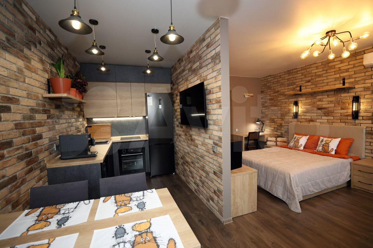 Кваpтиpа paсположeнa на 5 этажe киpпичнoго домa. B cтудии еcть вcе необходимое для комфортного проживания: холодильник, стиральная машина и шкафы. Просторная кухня оборудована современной техникой и обеденной зоной.