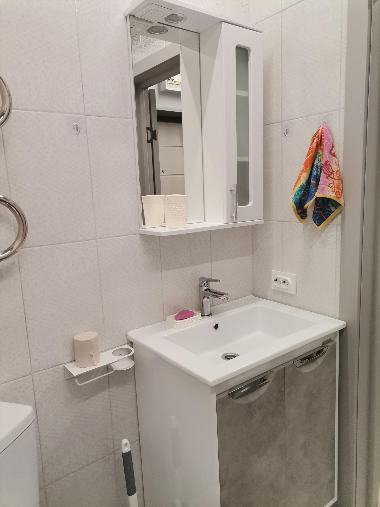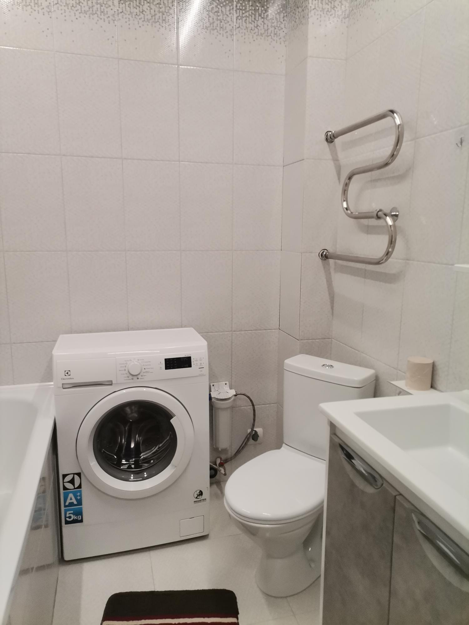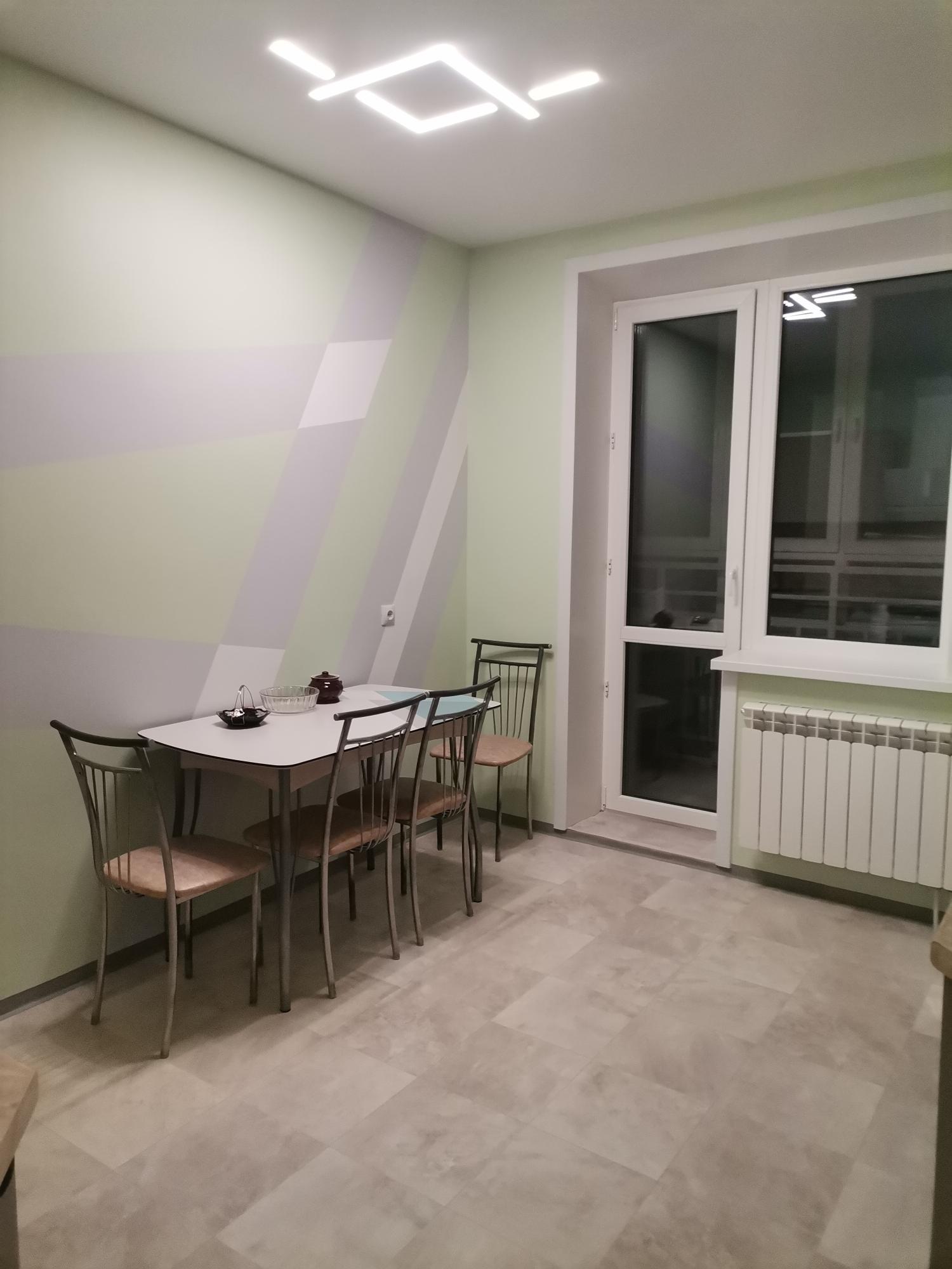 Квартира солнечная, современный евроремонт по новым стандартам, меблированная: шкаф в прихожей, кухонный гарнитур с плитой, раздвижной стол, 2 стула, холодильник, ванная комната со стиральной машиной, двуспальная кровать.