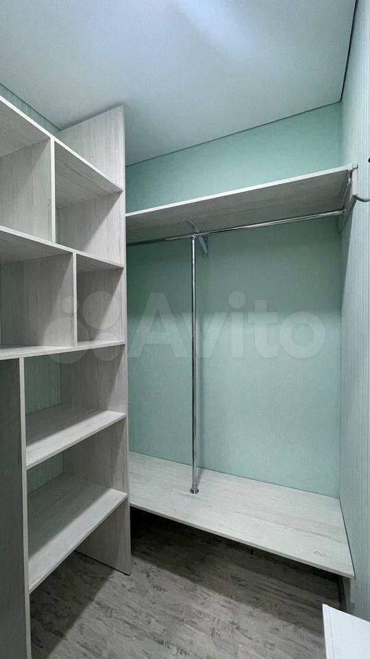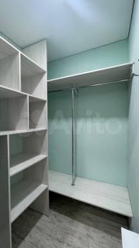 В комнате установлен удобный диван и шкафы для хранения вещей. Из мебели также предусмотрены вместительные полки и гардеробная. Санузел совмещенный, оснащен ванной и стиральной машиной.