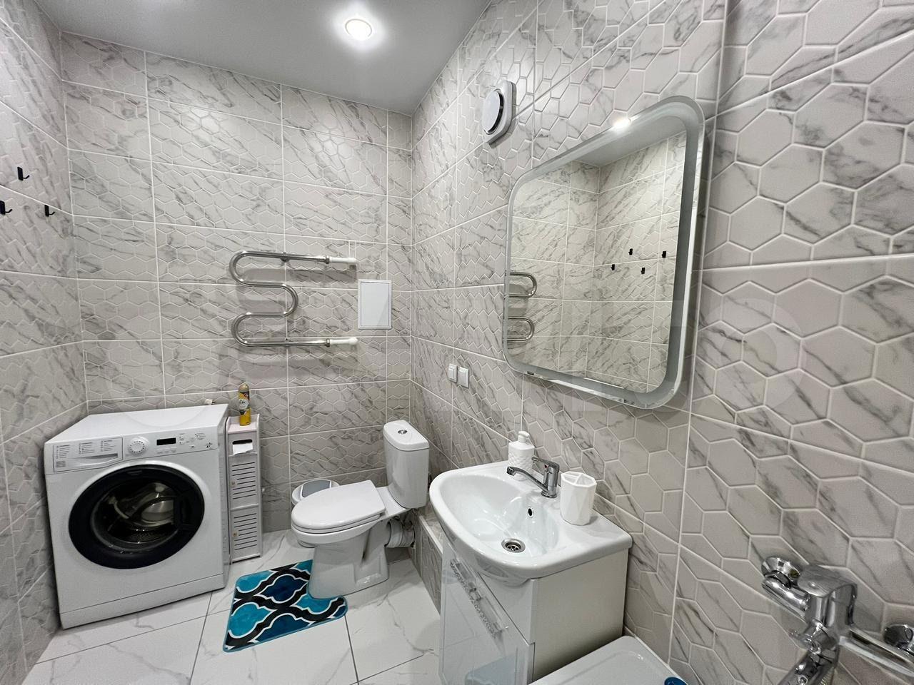 В ванной комнате совмещенный санузел с качественной сантехникой и стильной отделкой. Новая стиральная машинка автомат. В прихожей предусмотрен вместительный шкаф для хранения вещей.