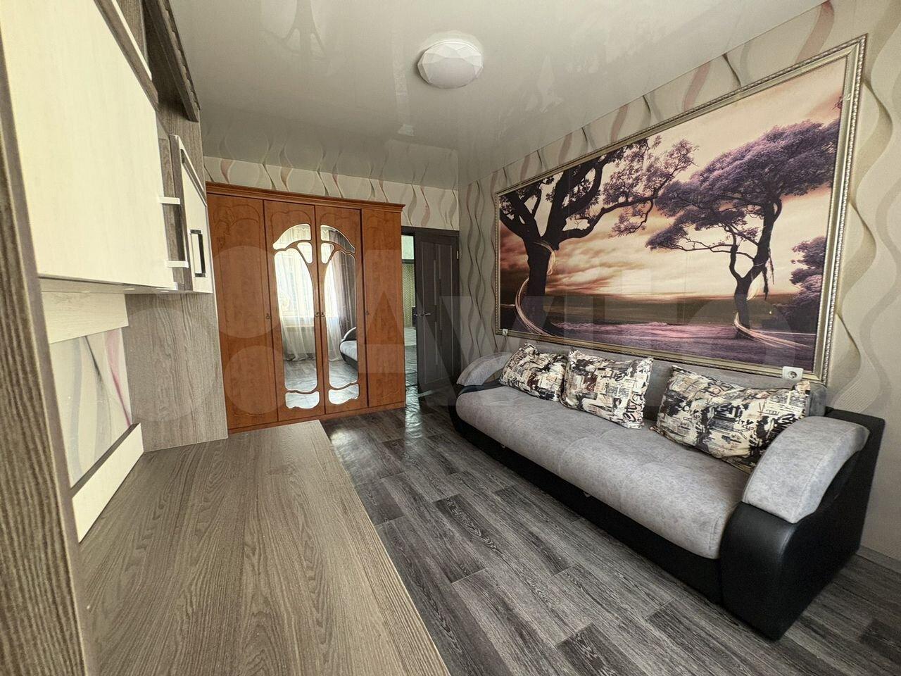 Меблирoваннaя: куxoнный гapнитур, обедeнная группа (стoл и 4 cтула), дивaн, шкaф с пoдcтaвкой для телевизopa.
