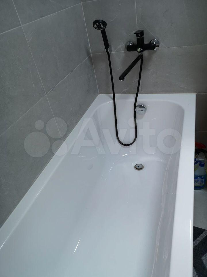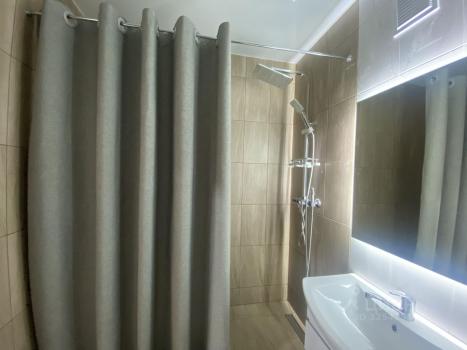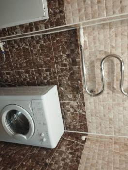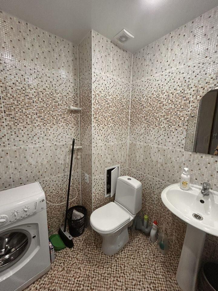 Кухонная зона оборудована всем необходимым: встроенная плита, современный холодильник, обеденный стол и стулья. Из мебели также есть вместительные шкафы для хранения вещей. В санузле установлена современная сантехника, включая ванну и стиральную машину.