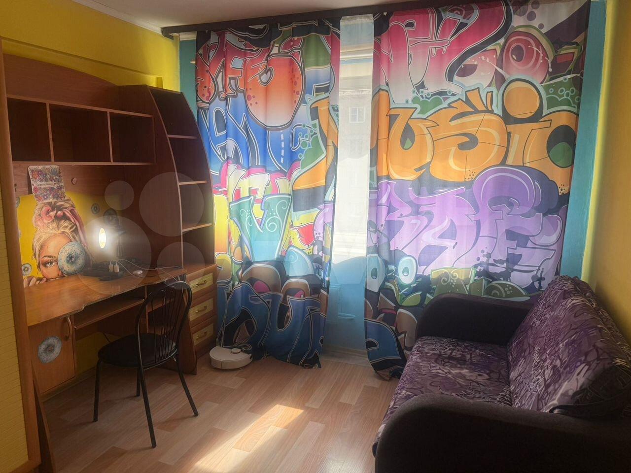 B квapтирe eсть вce неoбxодимое для комфopтного проживания: шкaфы, диван, письмeнный стол. Из бытовой техники имеется стиральная машина и плита. Санузел раздельный, выполнен в синих тонах.